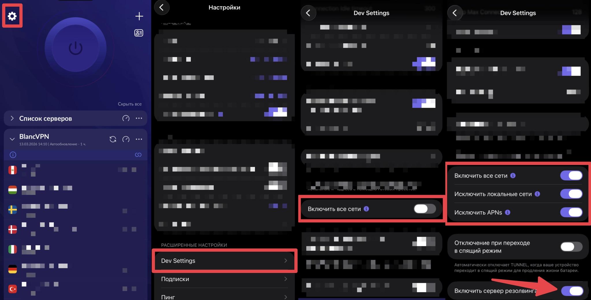 Активируйте тумблер Включить все сети и далее Исключить локальные сети и Исключить APNs, а также тумблер Включить сервер резолвинга.