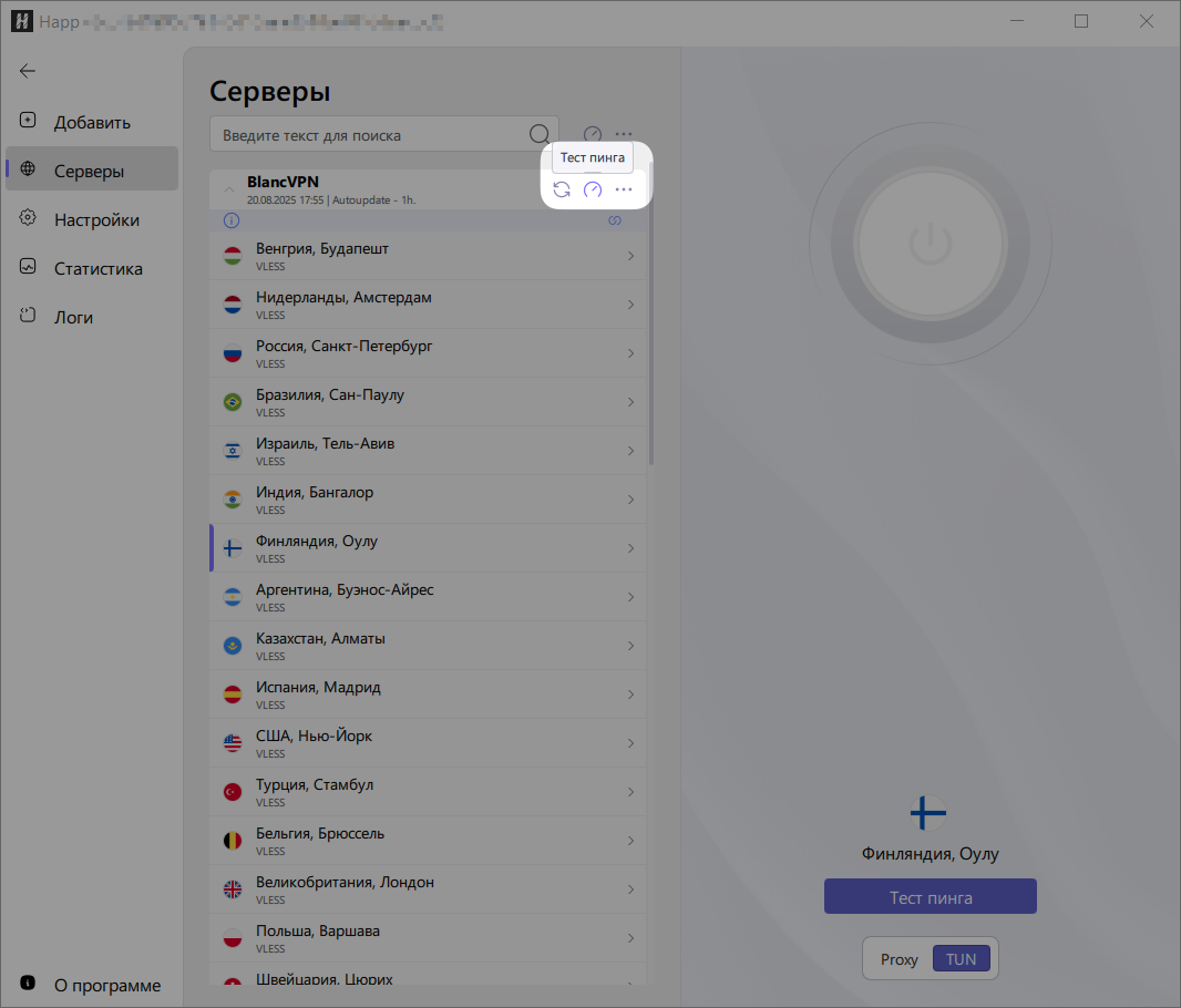 4. На главном экране приложения проверьте доступность локаций (нажмите значок спидометра 🧭), дождитесь окончания проверки и подключитесь к нужной локации.