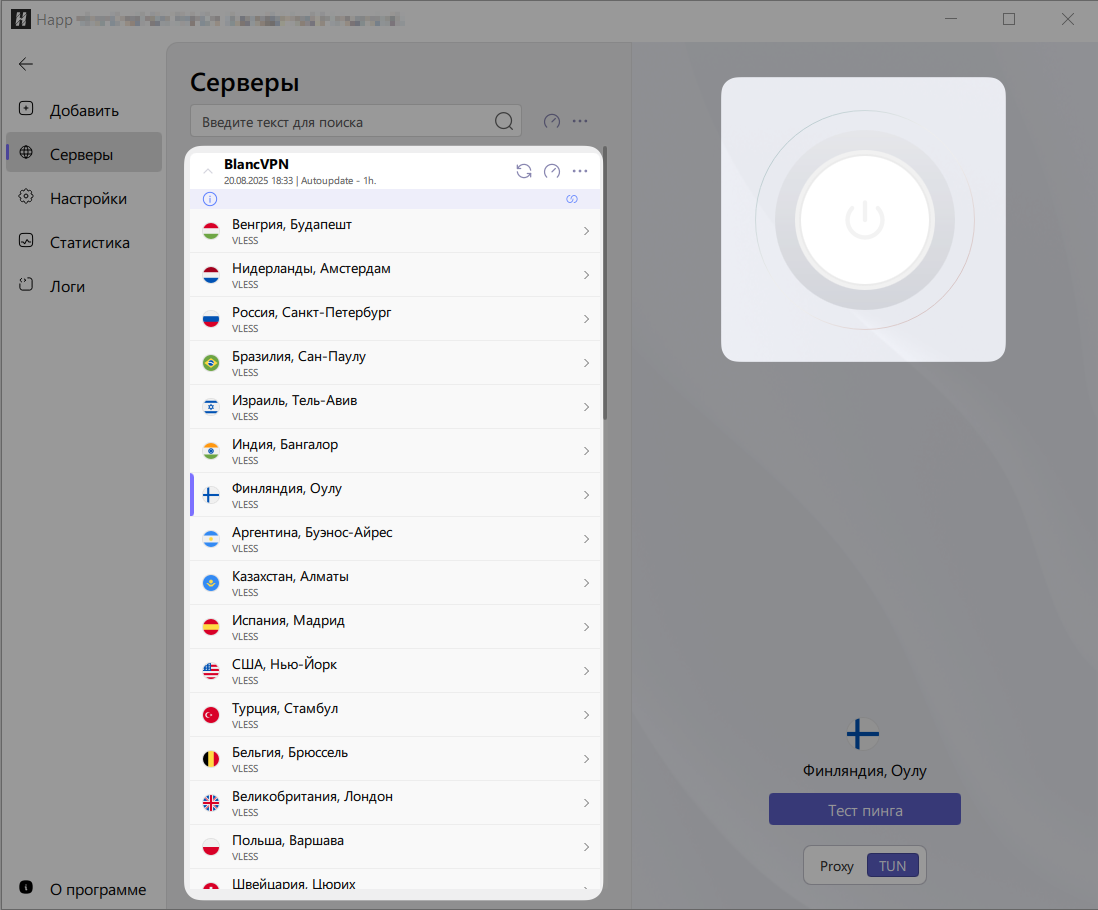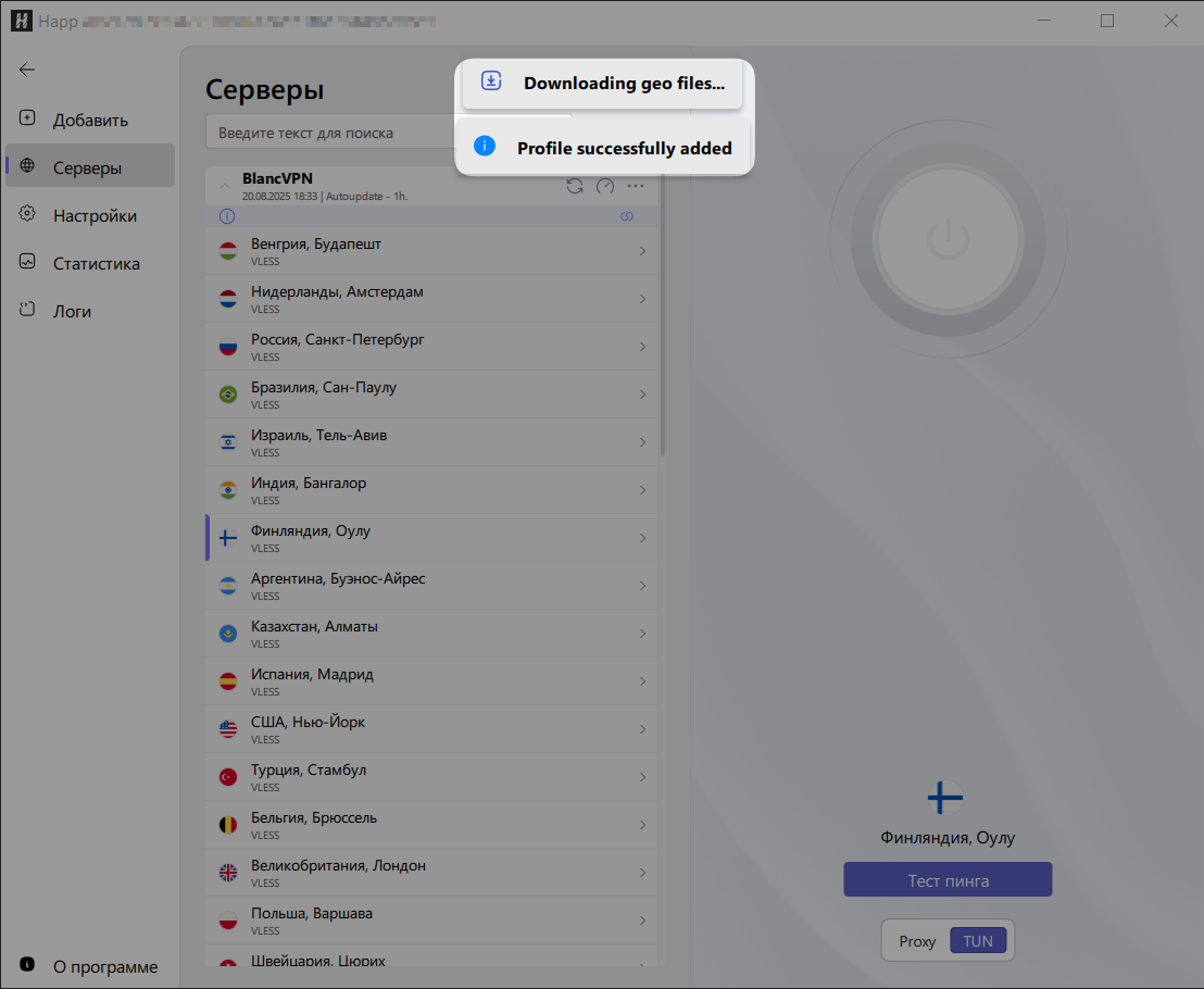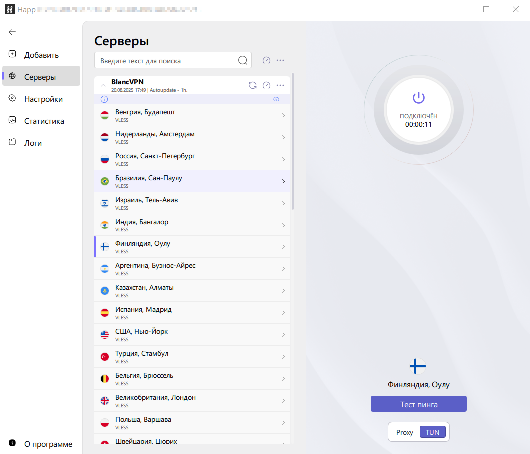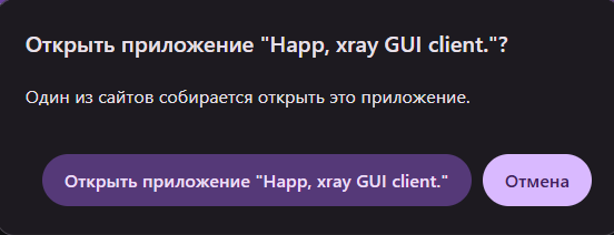 TUN-режим: приложение Happ забирает весь интернет-трафик вашего устройства, шифрует его и отправляет на VPN-сервер. Если интернет нужен для десктопных приложений, установленных на компьютере, включите TUN.