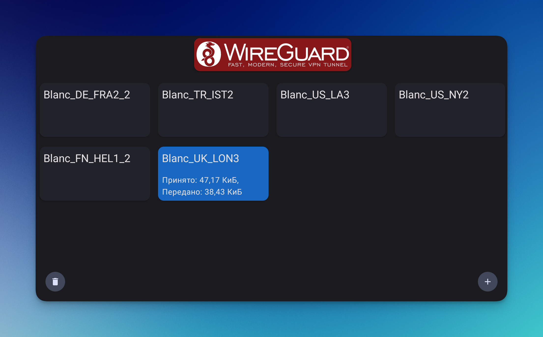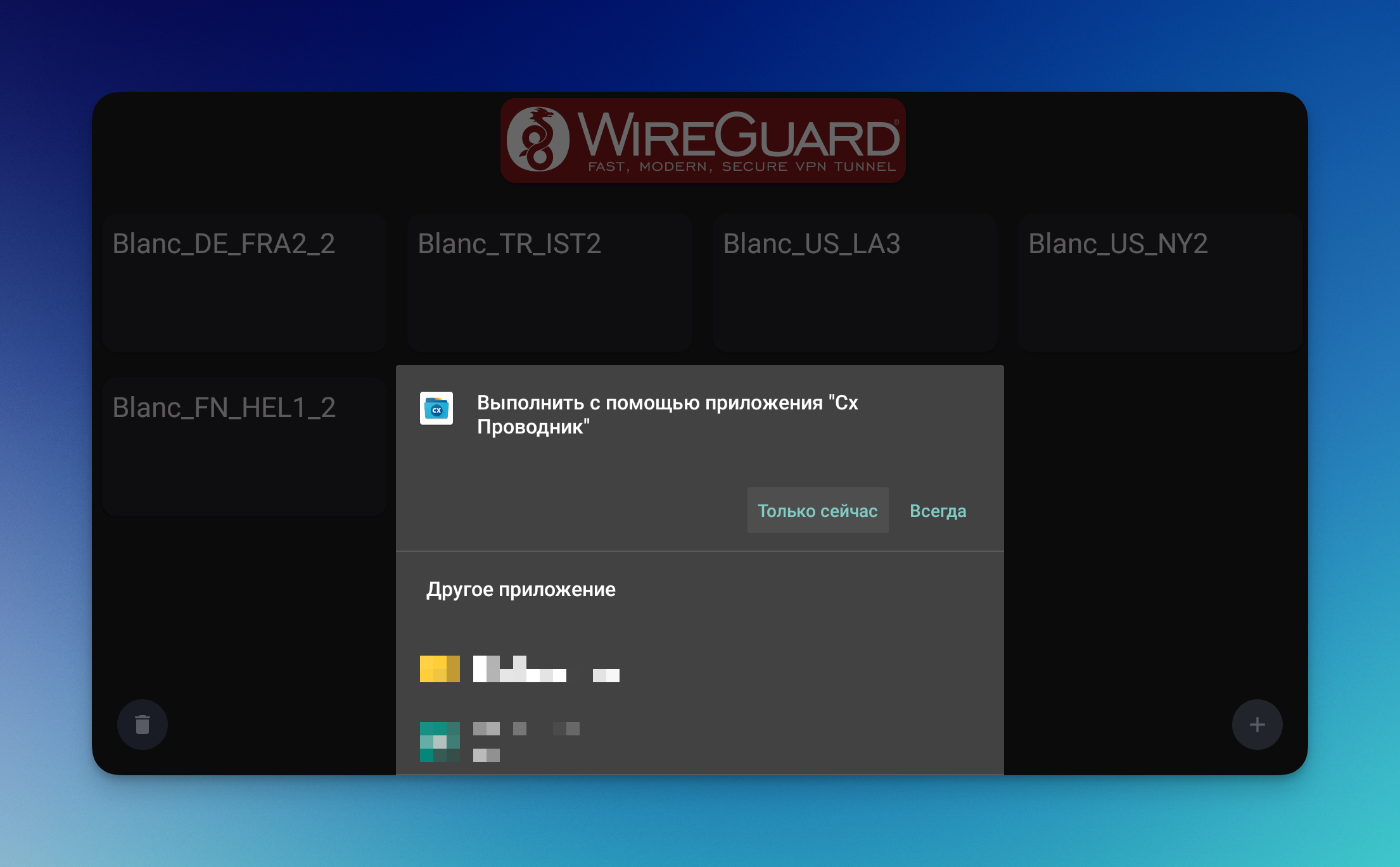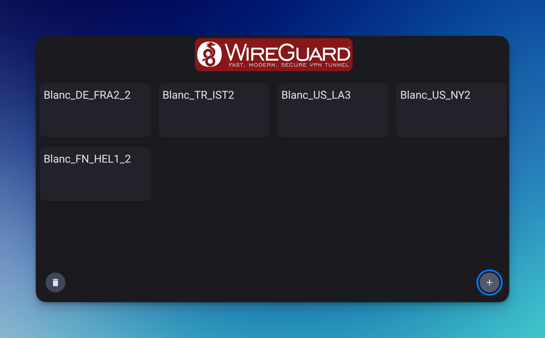 Войдите в личный кабинет BlancVPN в браузере на ТВ, скачайте файл конфигурации и импортируйте его в приложении WireGuard.